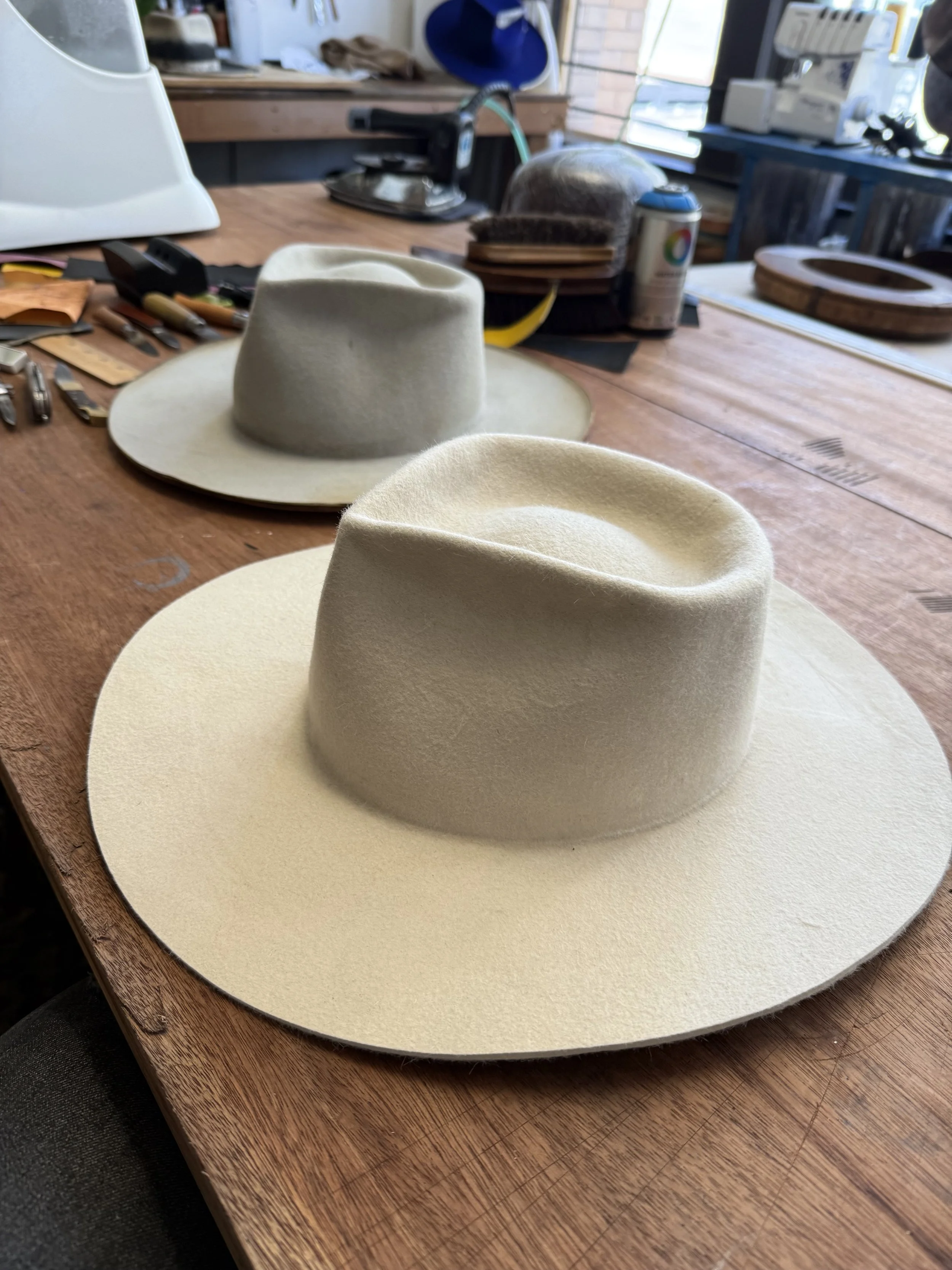 Every hat made is custom — built from the ground up to reflect your personal style, story, and spirit. Whether you’re starting with a bold idea or just know you want something that feels like you, I’ll guide you through the process of choosing the right size, color, shape, brim length, materials, and fire-touched finishes that make each piece truly one-of-a-kind.
