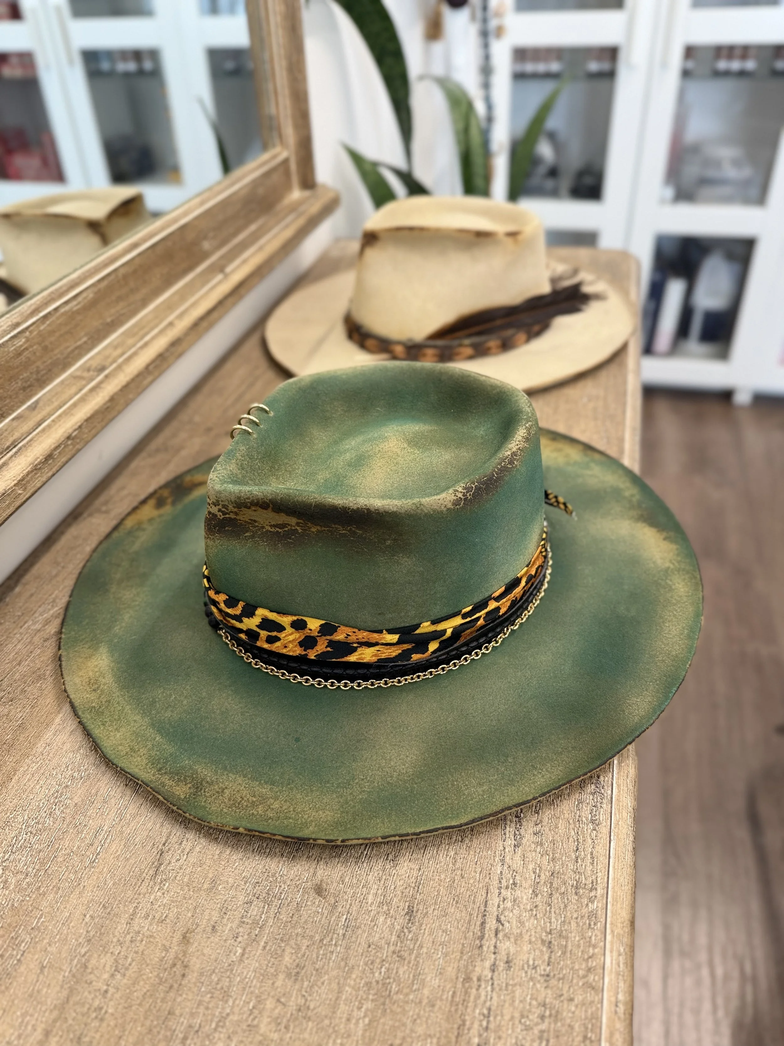 Hand-cut, shaped, sanded, colored and kissed by fire, each piece is crafted with intention. I work every crease, every burn, and every detail by hand, turning raw materials into something timeless. No two hats will ever be alike—because no two people are.